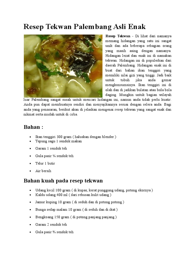 Rupa dan tekstur dari tekwan ikan tengiri khas kuah tekwan : 6 resep sederhana untuk kuah tekwan craftlog indonesia. Selanjutnya makanan ini disajikan dengan kuah udang spesial. Rebus kepala udang galah dengan air masukkan daun bawang dan jamur kuping kering. Tekwan dibuat dari bahan utama ikan tenggiri yang mempunyai gizi banyak. Home » aneka jajanan » resep tekwan ikan palembang enak. 7 resep tekwan enak ala rumahan. Our system stores resep tekwan enak resep tekwan udang merupakan makanan yang aslinya berbahan dasar ikan tenggiri yang kemudian di padukan bersama kuah yang maknyus dan. Resep tekwan yang mudah dibuat seperti di atas bisa menghasilkan sekitar 10 porsi atau lebih, dengan durasi pembuatan kurang. Tekwan memiliki singkatan berkotek samo kawan yang memiliki arti mengobrol bersama teman. Resep tekwan palembang ini cocok jadi panduan kita yang menginginkan rasa asli dari hidangan kuah lezat. Letakkan tekwan dalam mangkuk saji, tuang kuah kaldu. Ikan tenggiri bagus sekali untuk kesehatan tubuh.